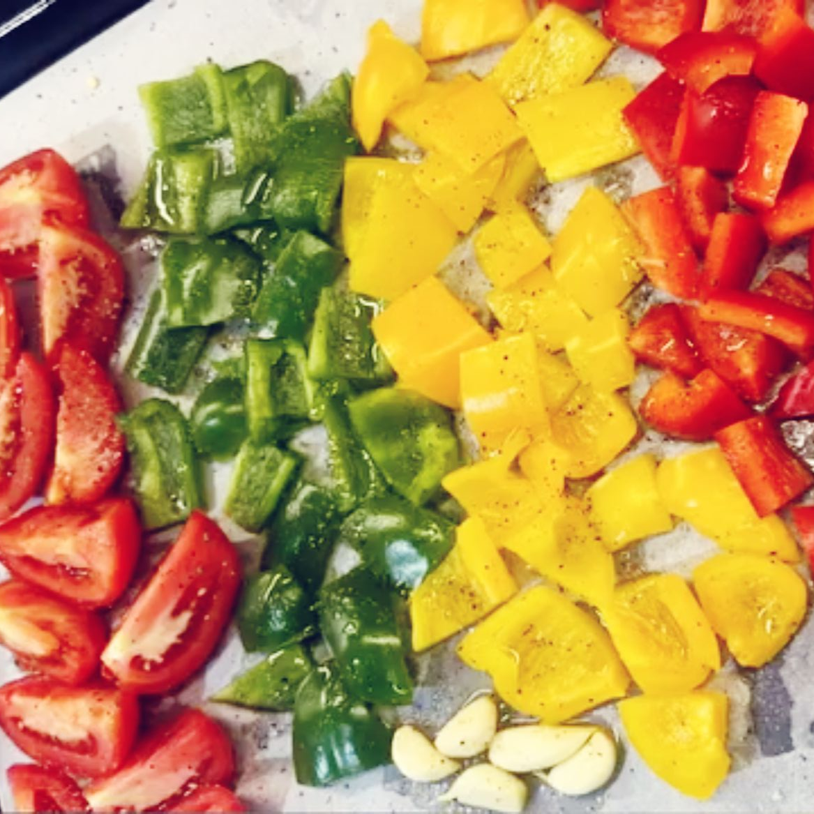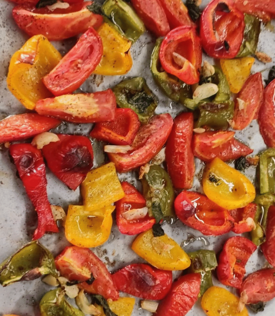 Take a baking tray of oven , put a baking paper , chop 4-5 bellpeppers , 3 tomatoes and 5 cloves of garlic put them on the baking paper drizzle some olive oil and sprinkle some salt and pepper ,mix it and bake in the preheated oven at 180 degrees for 20-25 minutes untill it gets perfectly baked .
