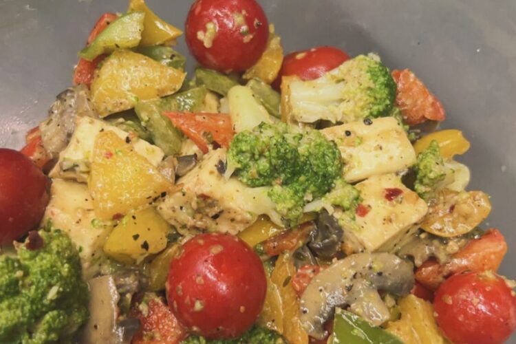 Add in the tomatoes, cherry tomatoes, boiled broccoli ,olives and paneer. Top it off with seasonings ;- salt to taste , chilli flakes , oregano, black pepper, basil and thyme to make this salad super delicious! Toss and mix them well.